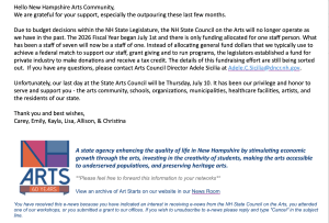 Due to budget decisions within the NH State Legislature, the NH State Council on the Arts will no longer operate as we have in the past. The 2026 Fiscal Year began July 1st and there is only funding allocated for one staff person. What has been a staff of seven will now be a staff of one. Instead of allocating general fund dollars that we typically use to achieve a federal match to support our staff, grant giving and to run programs, the legislators established a fund for private industry to make donations and receive a tax credit. The details of this fundraising effort are still being sorted out. If you have any questions, please contact Arts Council Director Adele Sicilia at Adele.C.Sicilia@dncr.nh.gov.